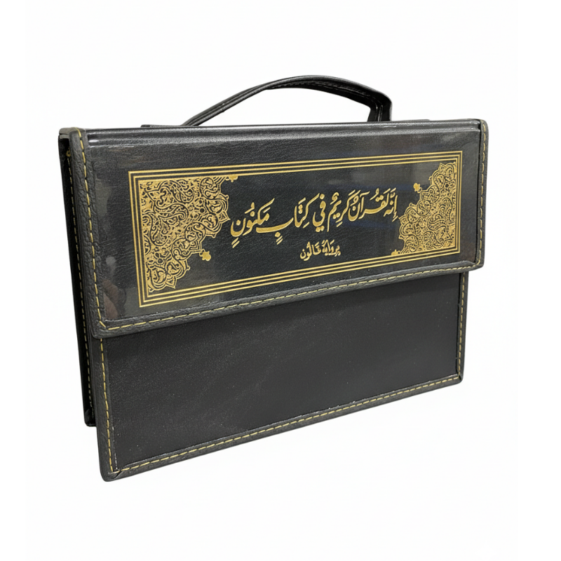 المصحف محفوظ داخل حقيبة أنيقة عالية الجودة بلون جذاب، مزينة بكتابة ذهبية راقية تحمل عبارة