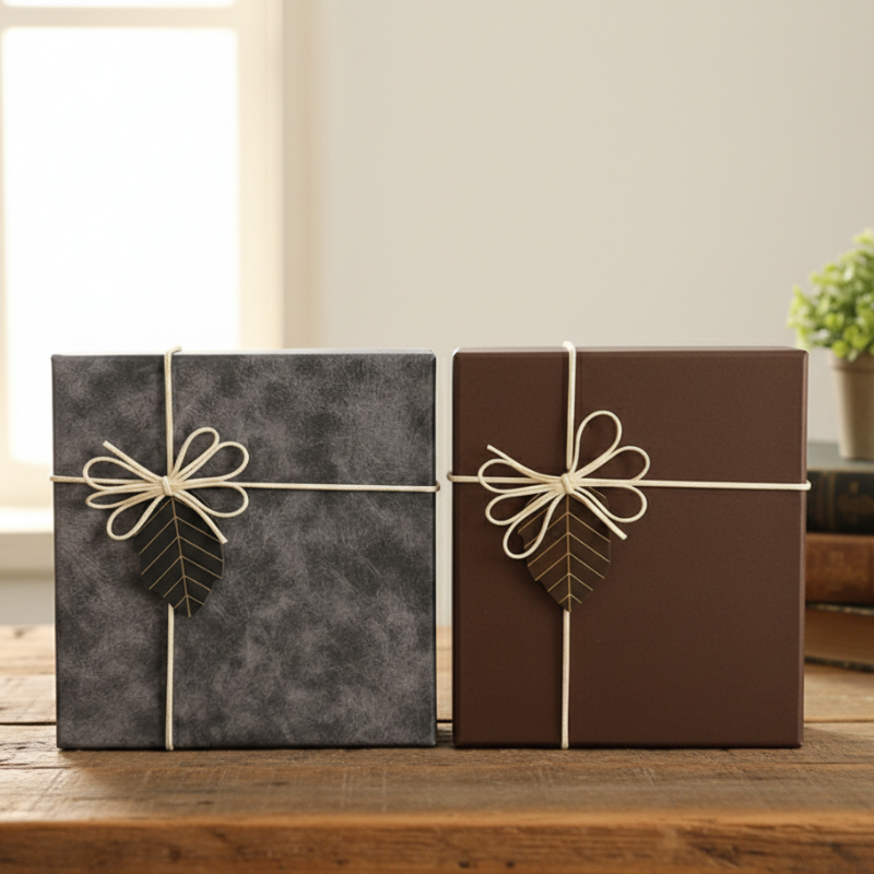 Grâce à sa structure solide et résistante, cette boîte protège parfaitement son contenu tout en offrant une présentation luxueuse. Son revêtement texturé moderne associé à un ruban décoratif avec détail feuille dorée crée un effet chic et sophistiqué.