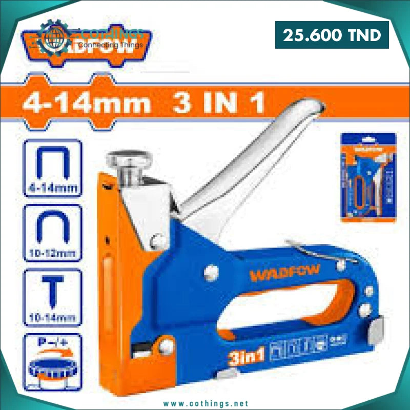 Agrafeuse 3 en 1 Force motrice réglable Agrafes : fil : 1,2 mm, couronne : 11,3 mm, longueur : 4-14 mm. Agrafes en forme de U : fil : 1,2 mm, couronne : 6,3 mm, longueur : 10-12 mm. Clous : fil : 1,2 mm, longueur : 10-14 mm. Emballé par carte coulissant