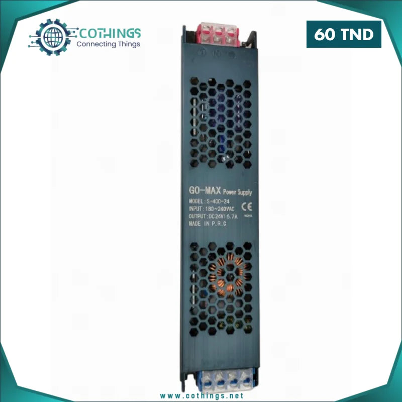 L’alimentation 24V 16,7A 400W est une source d’alimentation électrique conçue pour fournir une tension continue de 24 volts avec un courant maximal de 16,7 ampères, offrant une puissance totale de 400 watts. Elle est particulièrement adaptée pour des applications telles que l’éclairage LED, les écrans électroniques et divers équipements industriels nécessitant une alimentation stable en 24V.