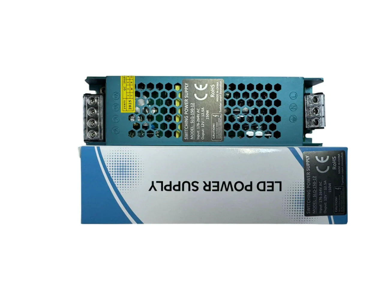 L’alimentation à découpage 150W, possède un interrupteur pour sélectionner la tension d’entrée entre AC 176~264V et une sortie de 12V-DC 12.5A, la tension de sortie peut être ajustée autour de ± 10%, compensant la chute tension entre la source d’alimentation et le point de consommation.