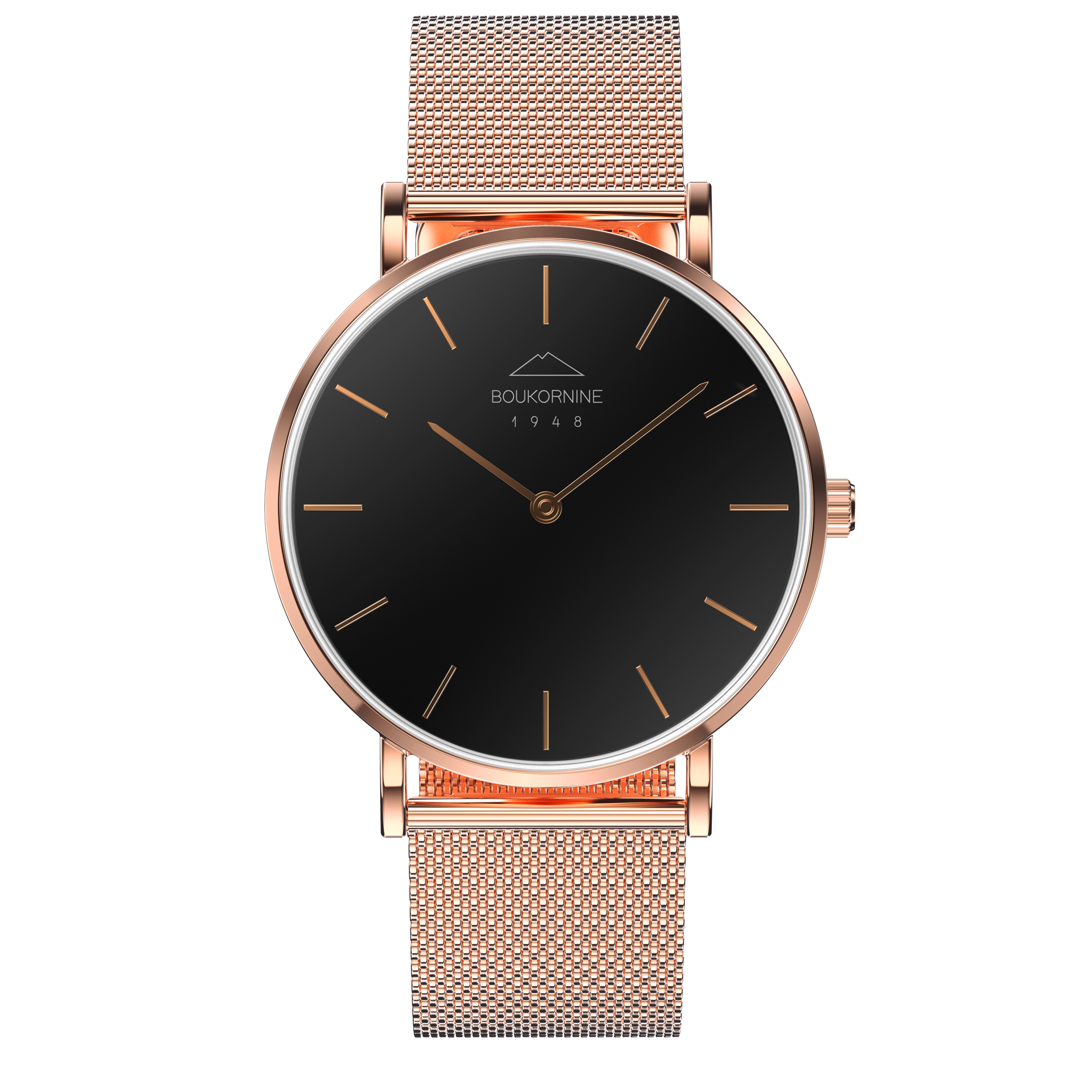 La montre est délicatement plaquée en or rose, donnant à cette pièce une élégance douce et raffinée. Le bracelet milanais apporte une touche de luxe naturel et une sensation de confort indéniable.