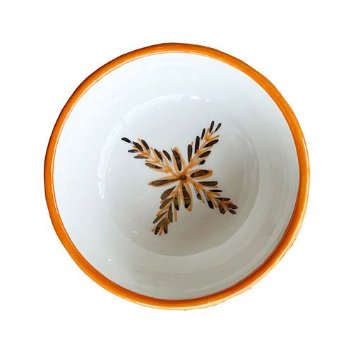 Ce bol en céramique, fait à la main, est une pièce d’artisanat unique. L’extérieur et le bord supérieur du bol sont d’un orange vif, créant un contraste saisissant avec l’intérieur blanc. Au centre du bol, un motif floral stylisé est peint en orange et en noir, ajoutant une touche de nature et de délicatesse à la pièce.