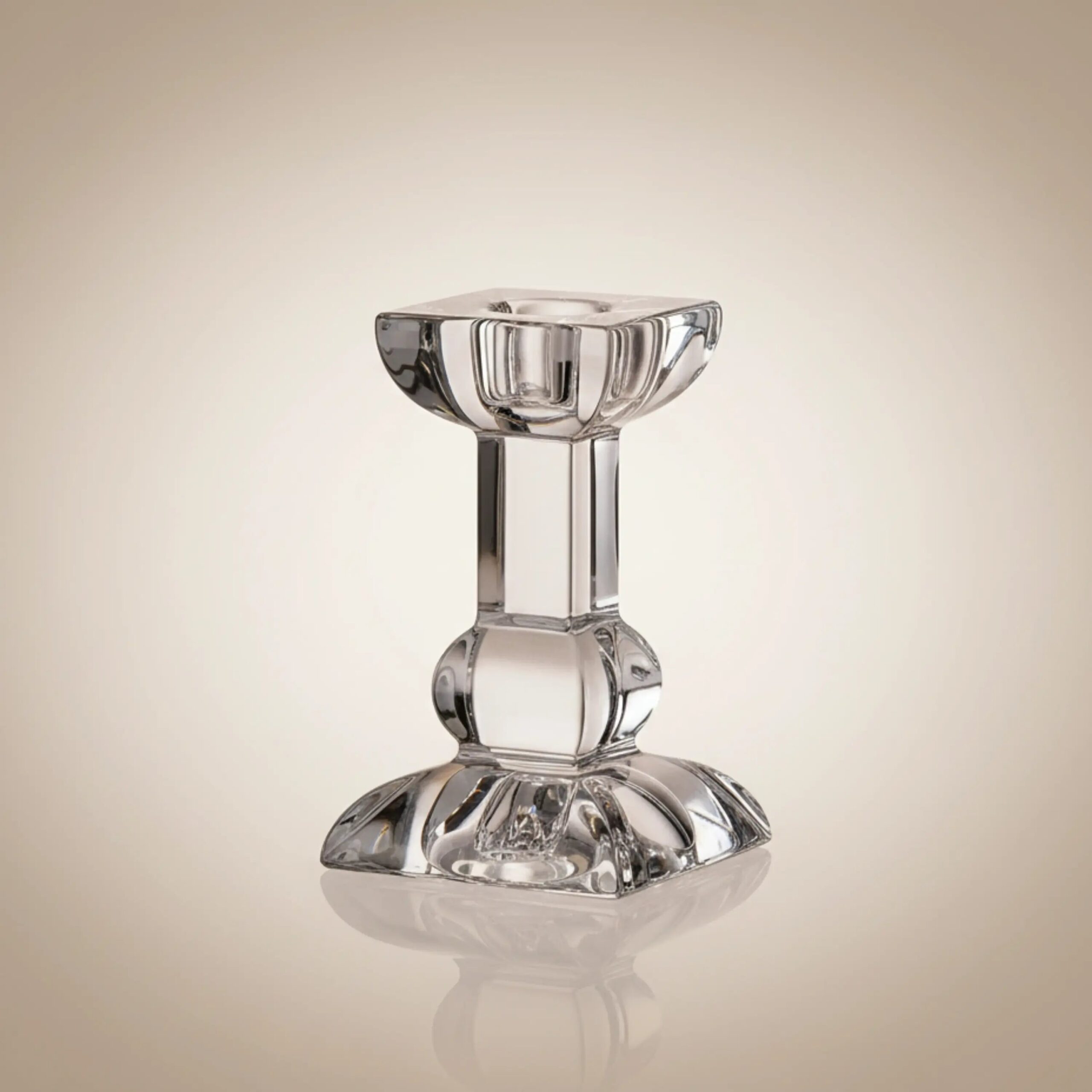 Sa forme rectangulaire aux angles doux, avec une base large et stable, un pied droit et un col légèrement évasé, est pensée pour accueillir parfaitement les bougies chandelier stick (standard 2,2 cm de diamètre). La lumière de la flamme se reflète dans chaque facette, créant des jeux d’éclats qui animent la pièce.