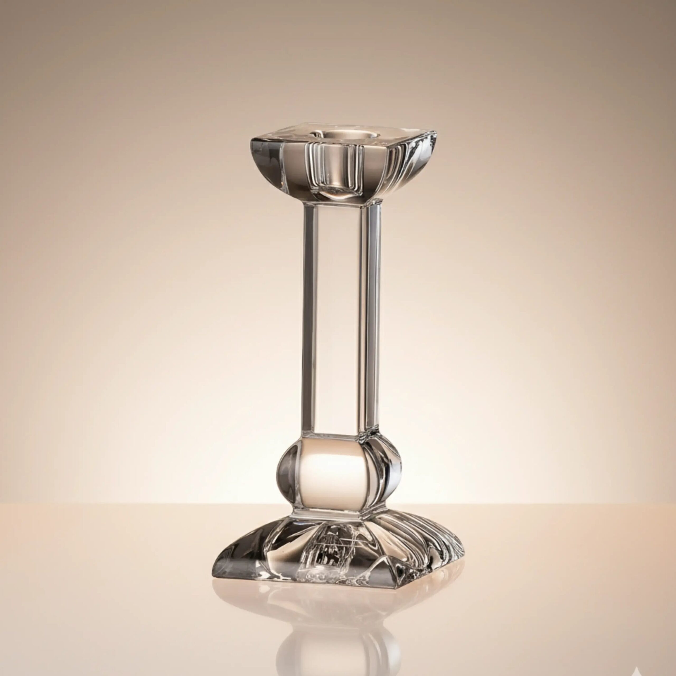 Le Bougeoir Ravena 15 cm incarne une présence affirmée, sans jamais être ostentatoire. Fabriqué en cristal de Bohême authentique, il reprend le design géométrique épuré de la collection Ravena — base carrée stable, pied rectangulaire droit, col légèrement évasé — mais dans une version plus élancée, idéale pour les grandes tables, les buffets ou les décors de réception.