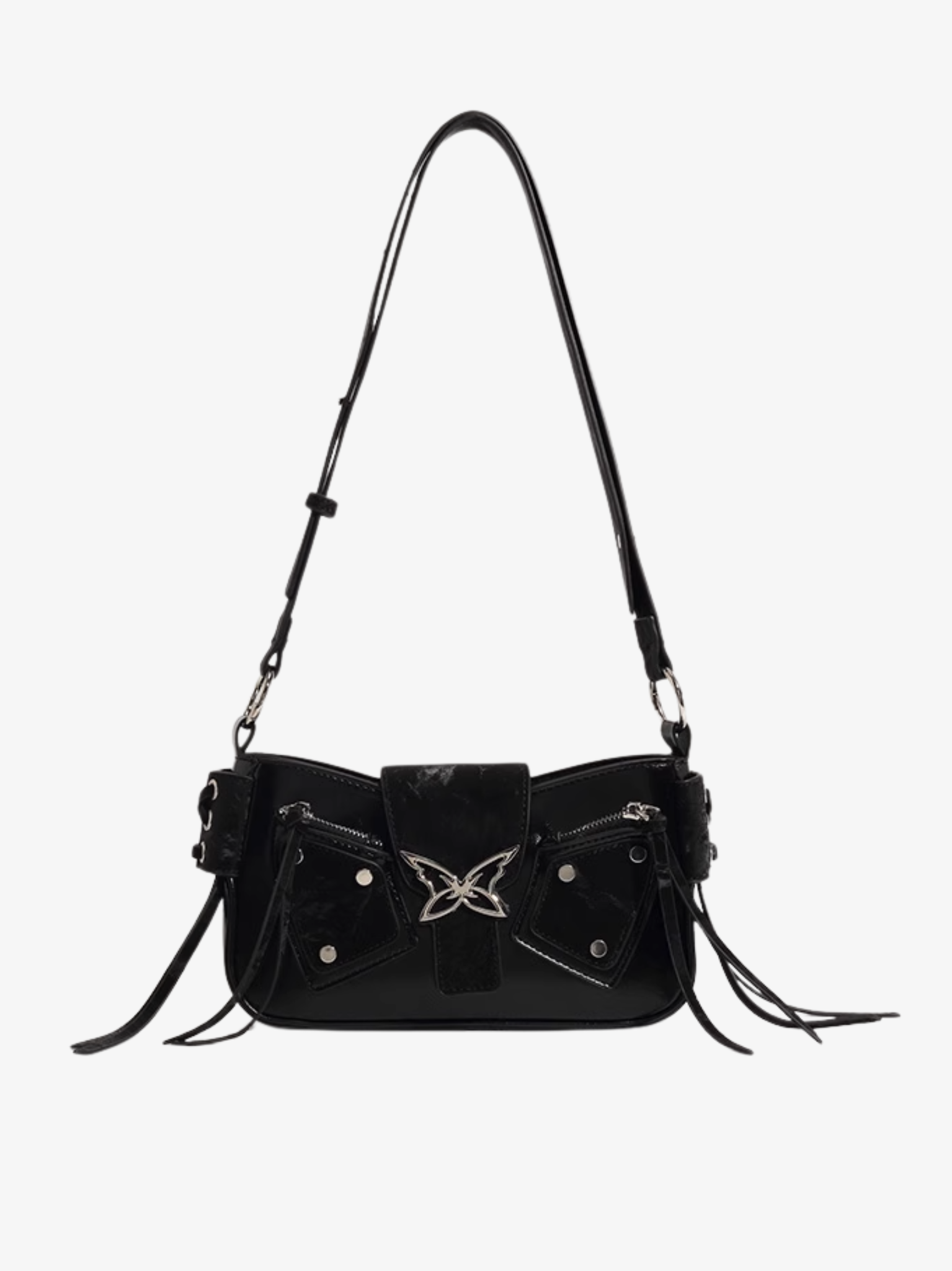 This Y2K-inspired armpit bag for women combines style and functionality with its compact square design and versatile crossbody strap. Featuring a sturdy rivet detail and a charming bow accent, it offers a modern edge while comfortably fitting under the arm for secure daily use. Ideal for commuters, this small bag effectively organizes essentials without sacrificing aesthetic appeal.