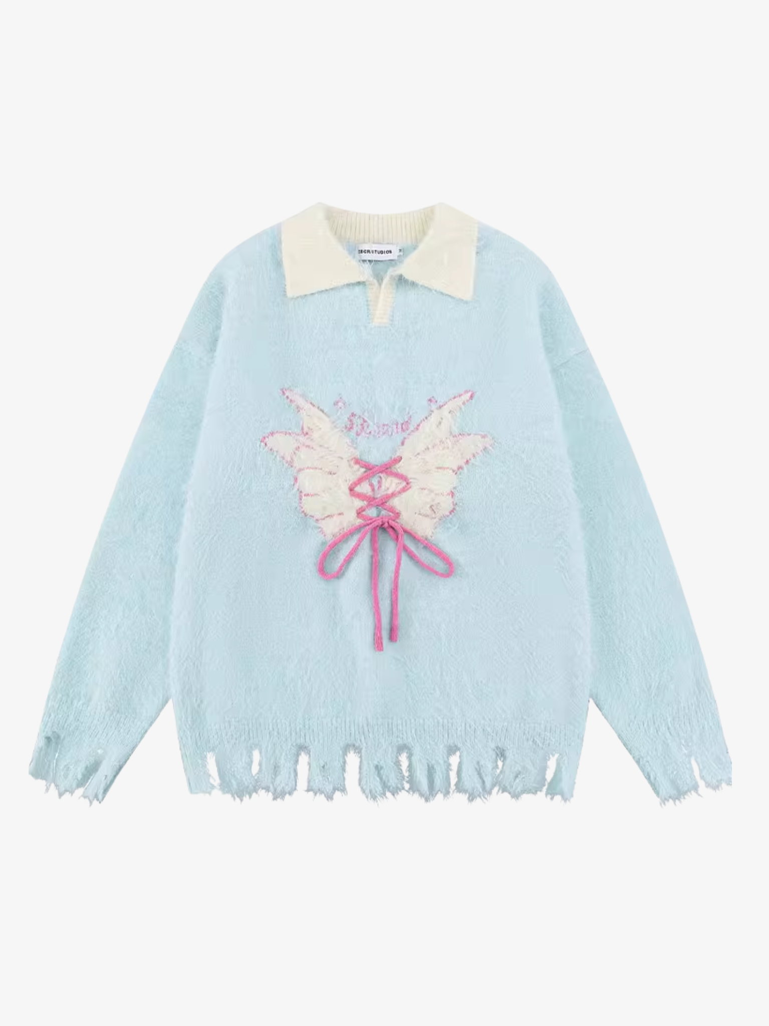 Experience unmatched comfort with this soft, lush butterfly color-block knit sweater. Featuring a relaxed polo neck and a unique butterfly motif, this versatile knitwear suits both men and women. The calming milk blue shade evokes a dopamine boost, making it perfect for stylish, cozy wear all year round.