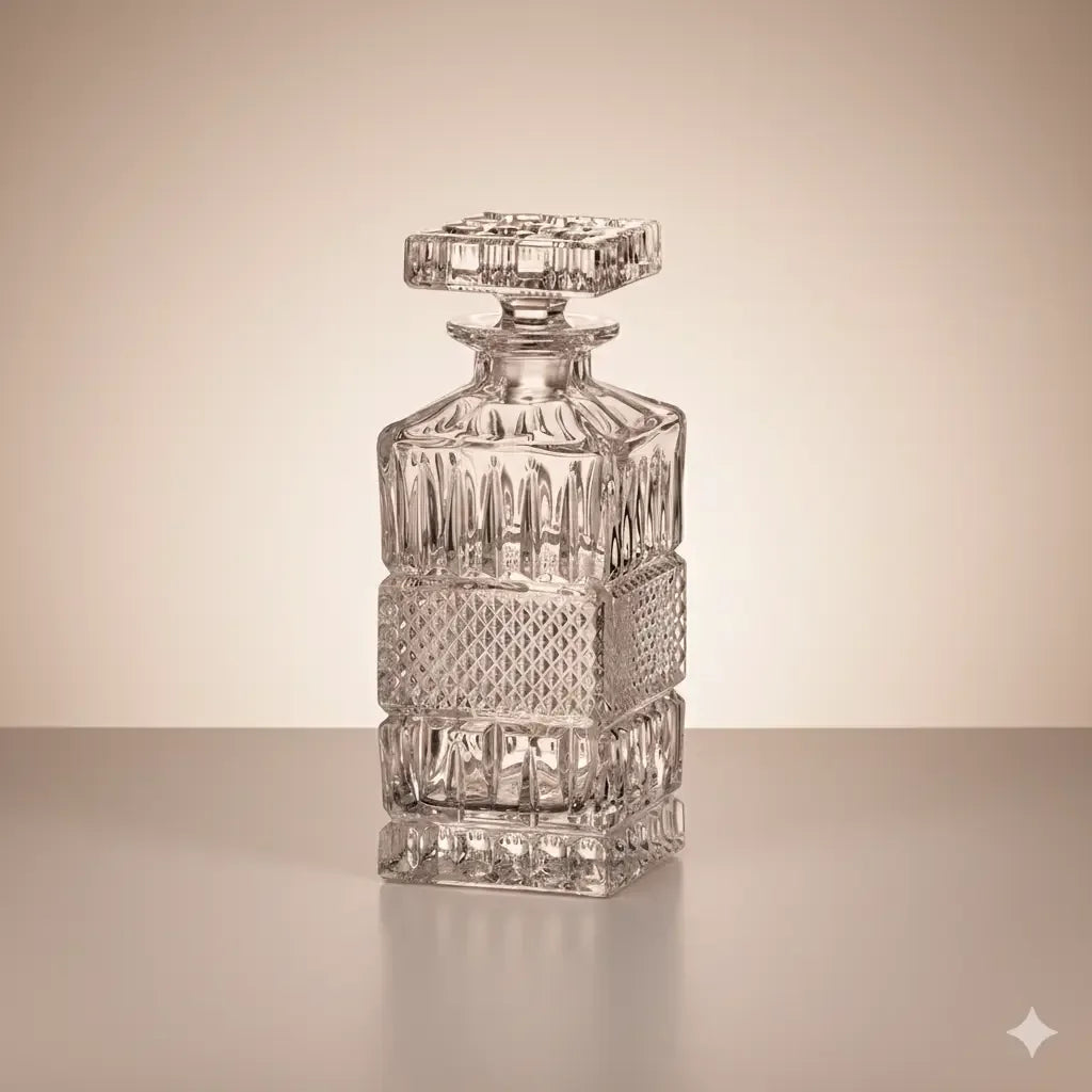Fabriquée à la main en cristal de Bohème de haute qualité, cette carafe de 700 ml est une véritable œuvre d’art. Son design carré, à la fois classique et élégant, est orné de motifs taillés en losanges, créant un jeu de lumière spectaculaire et mettant en valeur les spiritueux qu’elle contient. Le bouchon, lui aussi en cristal, complète harmonieusement l’ensemble.