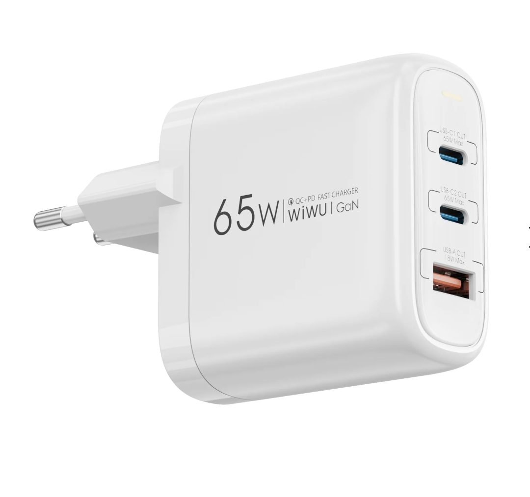Le WiWU Ark 65W (Wi-U024) utilise la technologie GaN pour offrir une performance exceptionnelle dans un format compact. Il dispose de deux ports USB-C et un port USB-A pour alimenter simultanément smartphone, tablette ou ordinateur portable.