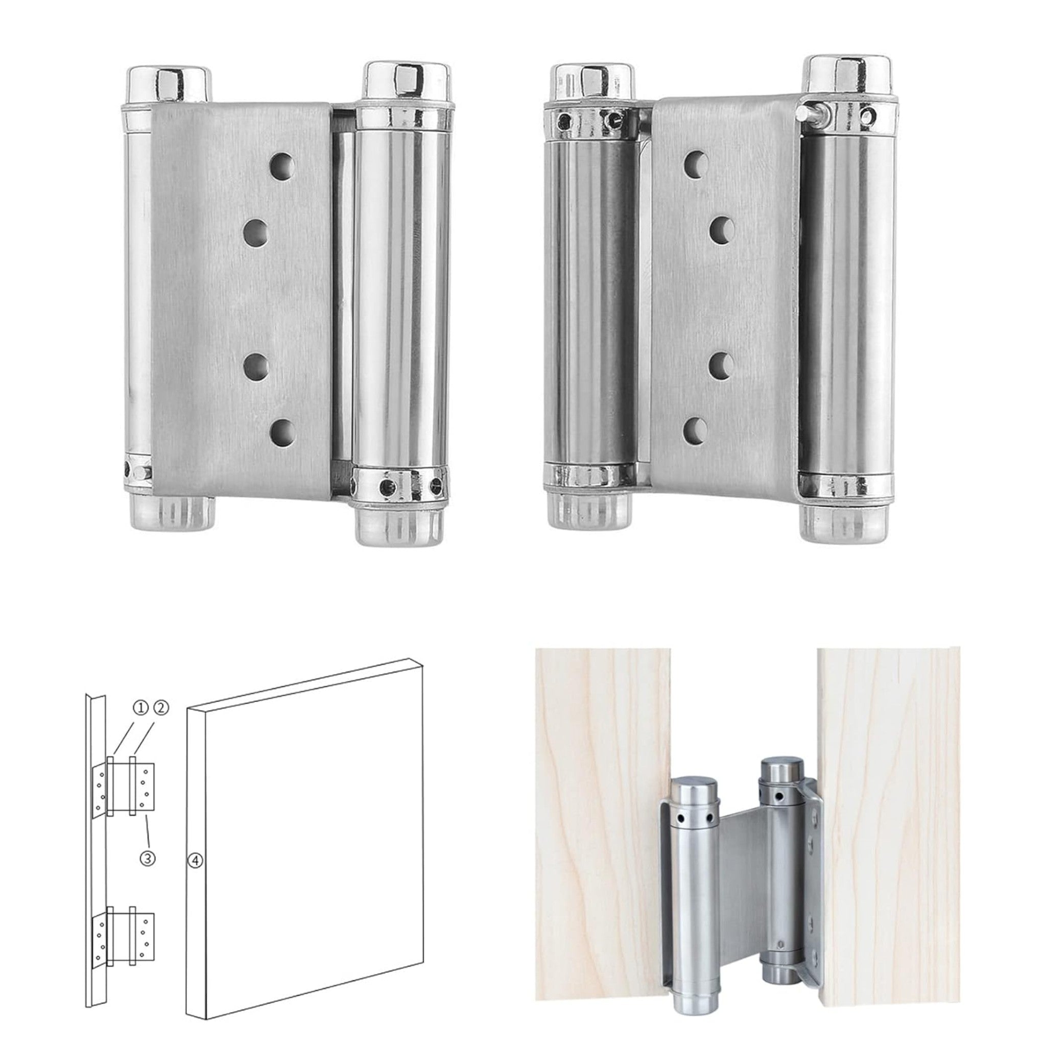 Charnière en acier inoxydable double action va-et-vient haute qualité. Disponible en 4 tailles : 3″/75mm, 4″/100mm, 5″/125mm et 6″/150mm. Finition inox durable et résistante à la corrosion.