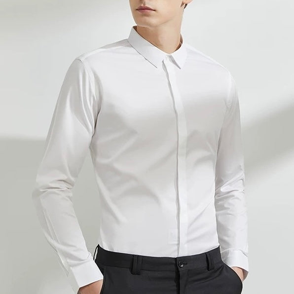 Chemise élégante avec col italien, parfaite pour un look chic et raffiné. Confectionnée dans un tissu de haute qualité, elle offre un toucher doux et un excellent confort tout au long de la journée. Son design se distingue par une patte de boutonnage cachée, offrant une finition épurée et sophistiquée. Le col italien, légèrement évasé, ajoute une touche moderne qui s’adapte aussi bien aux tenues formelles qu’aux occasions décontractées.