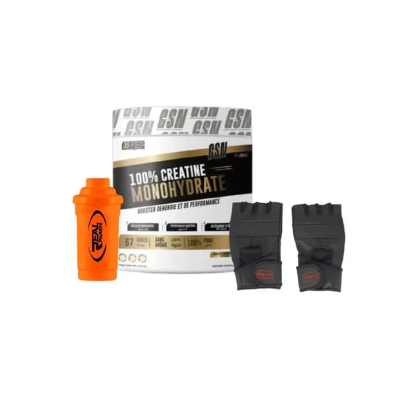 Creatine Monohydrate 200G Pack Creatine gsn+ Gants En Cuir + Shaker 700 Ml Ce pack complet est idéal pour les sportifs désireux d’optimiser leurs performances et leur confort pe…