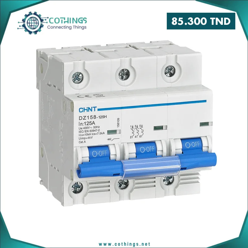 Le disjoncteur modulaire DZ158-125H de CHINT assure une protection fiable contre les surcharges et courts-circuits dans les installations électriques basse tension. Avec une capacité de coupure de 10 kA et un courant nominal de 80 A, il est idéal pour les installations triphasées résidentielles, tertiaires ou industrielles.