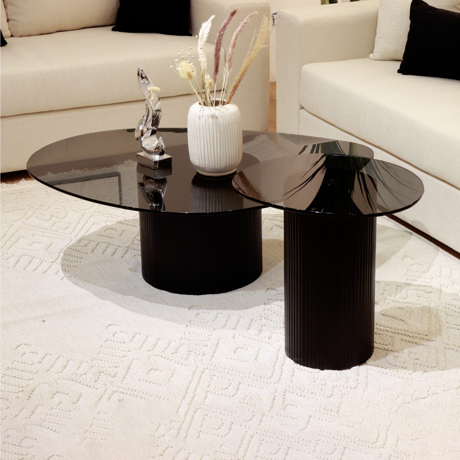 Matières Nobles et Finitions Luxueuses Chaque table repose sur un socle cylindrique imposant en bois massif noir, travaillé avec un relief strié qui capte la lumière et apporte une texture organique à votre décoration. Le plateau est couronné d’un verre fumé de sécurité, offrant une profondeur visuelle élégante tout en garantissant une résistance optimale aux chocs et aux rayures.