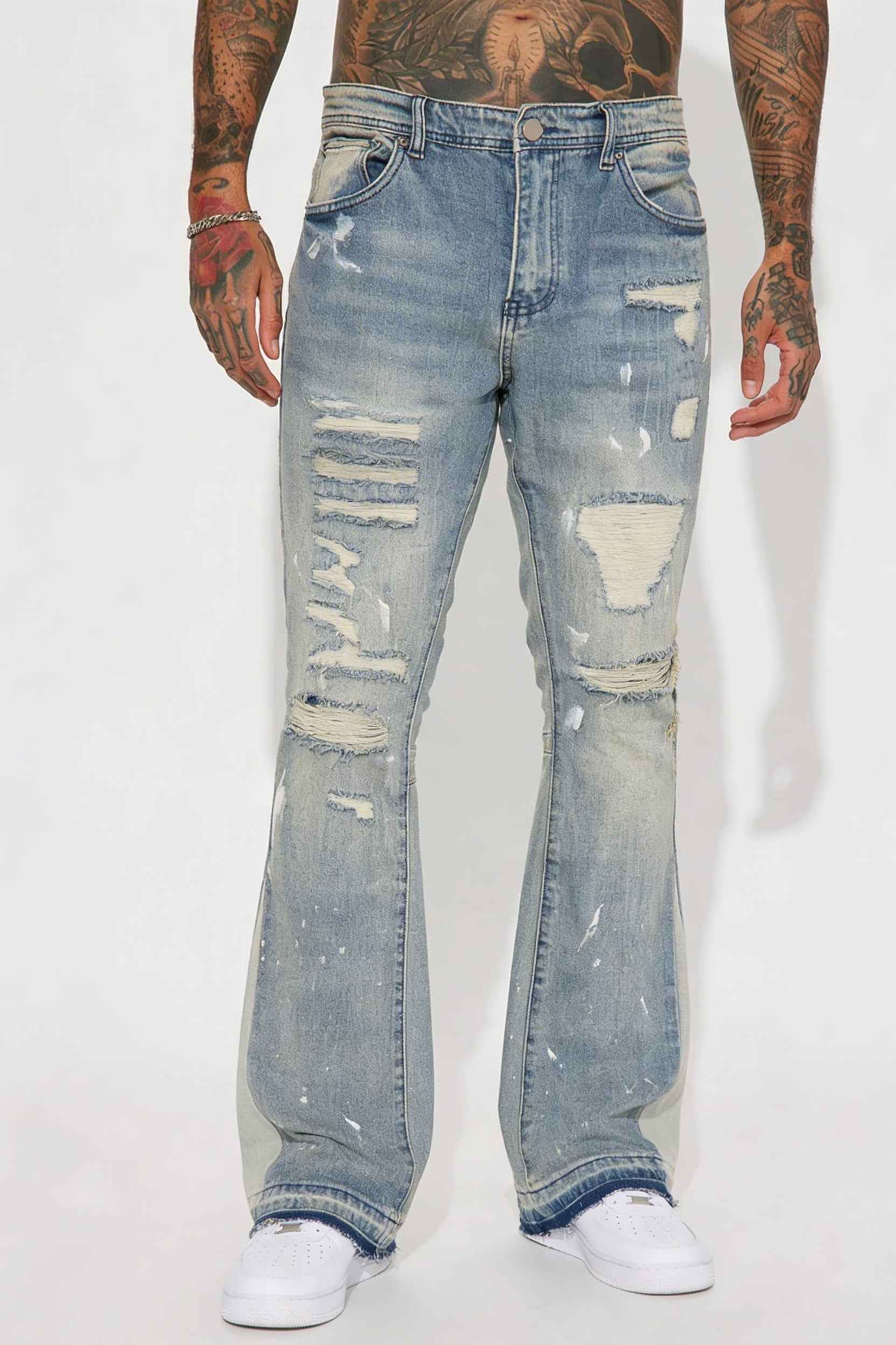 The GALLERY DEPT Flared Jeans in Vintage Blue feature a distinctive paint splatter design that enhances their aesthetic appeal. Made from durable denim, these jeans provide both comfort and longevity. The flared cut offers a stylish silhouette, making them suitable for various occasions.
