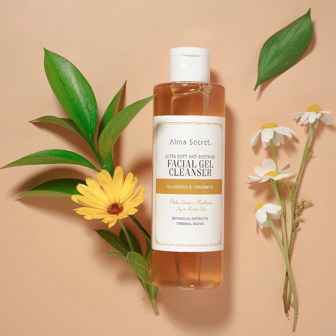 Gel nettoyant visage ultra-doux — Calendula & Camomille : Gel moussant très doux qui élimine impuretés et maquillage sans dessécher, apaise et protège la barrière cutanée. Enrichi en calendula, mauve & camomille infusées en eau thermale, avec tensioactifs d’origine naturelle et AHA de fruits pour lisser délicatement et raviver l’éclat. Sans sulfates ni alcool, pH neutre, vegan. 200 ml.