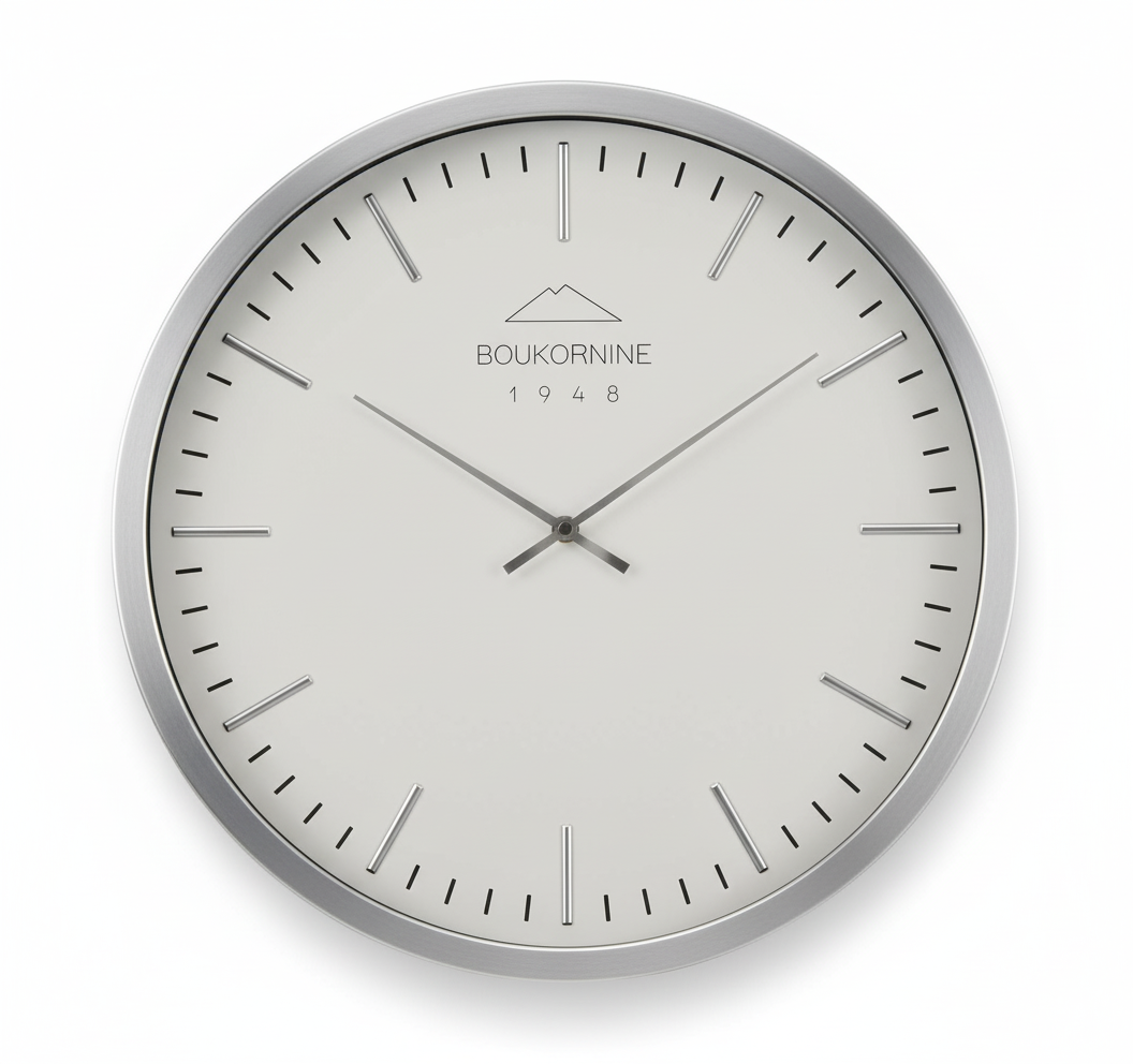 Cette horloge Boukornine incarne l’essence du design minimaliste : un cadran clair, des lignes épurées et un cadre en aluminium argenté d’une finesse remarquable.