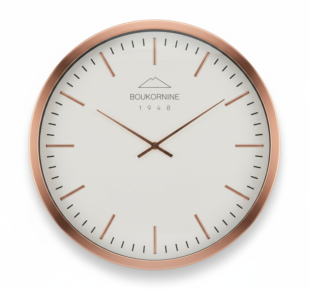 Cette horloge Boukornine associe un cadran clair à un cadre en aluminium cuivré pour créer une harmonie rare entre modernité et chaleur. Sa finition métallisée capte la lumière avec subtilité, apportant une touche d’élégance à tout intérieur, du salon au bureau.