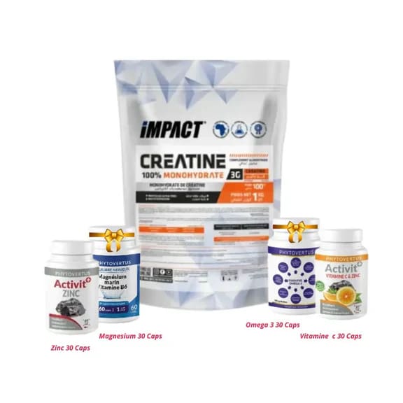 Impact Sport Nutrition 100 % Monohydrate Creatine1 KG + 2 Cadeaux : Magnesium , Omega 3