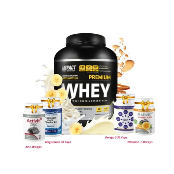 Impact Sport Nutrition – Premium Whey 1800 G + 4 Cadeaux : Magnesium , Omega 3 , Zinc , Vit C e pack Impact Sport Nutrition Premium Whey est une offre complète pour les sportifs..