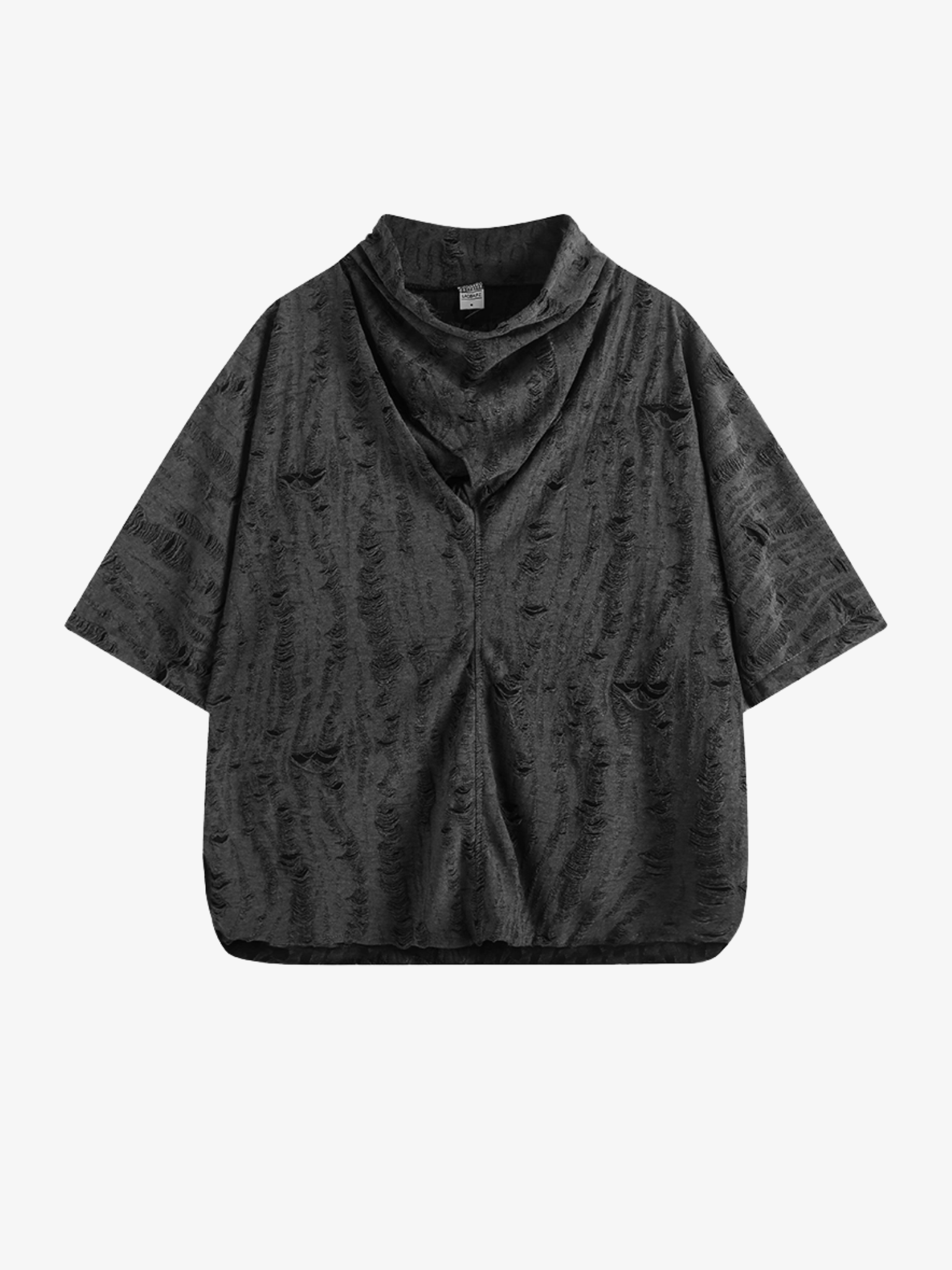 This irregular dark men’s summer T-shirt is crafted from high-quality ice silk, ensuring a cool and breathable feel during warm weather. Its unique design features ripped details, a half neck, and five-quarter-length sleeves, combining contemporary style with comfort. Ideal for those seeking a distinctive, fashion-forward shirt that maintains a lightweight and soft touch throughout the day.