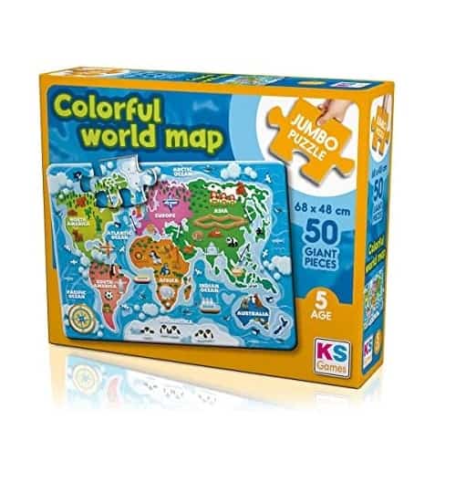 Jumbo Puzzle carte du monde 50pcs, marque KSGAMES. Puzzle de très haute qualité, carton épaisseur de 2.5mm et impression haute définition pour avec un assemblage parfait. A partir de 5 et plus. Le puzzle Jumbo de la carte du monde permettra à votre enfant de connaitre les particularité des différentes région du monde! Jeu éducatif 100%
