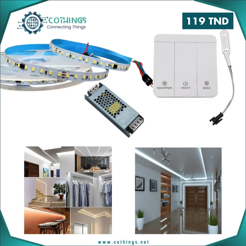 Ce kit complet d’éclairage LED 24 V comprend une bande LED blanche froide de 10 mètres (6500 K), une télécommande RF sans fil, et une alimentation 24 V – 4.16 A (100 W) offrant une solution stable et sécurisée pour l’éclairage architectural, décoratif ou fonctionnel.