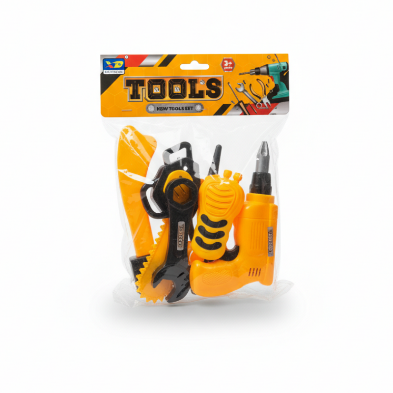 Le coffret comprend plusieurs outils réalistes en plastique léger et sécurisé : perceuse, clé, scie circulaire, tournevis et autres accessoires. Adaptés aux petites mains, ces outils favorisent le développement de la coordination œil-main, de la motricité fine et des compétences pratiques.