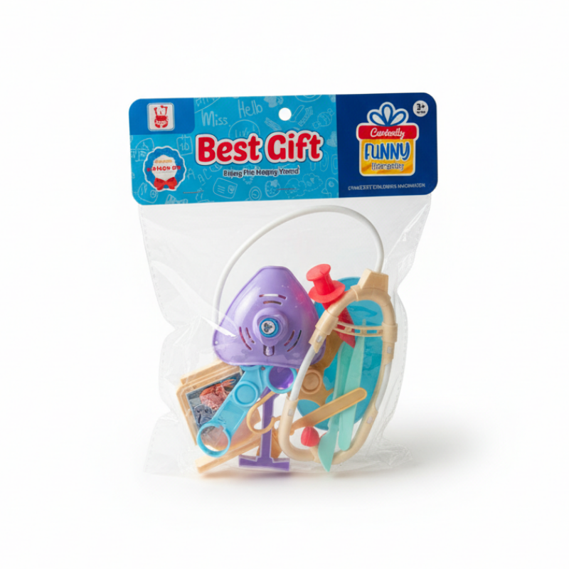 Le coffret comprend plusieurs outils médicaux en plastique léger et sécurisé, adaptés aux petites mains : masque médical, stéthoscope, instruments de soin et autres accessoires. Ce jeu favorise le développement de la motricité fine, de la communication et de la confiance en soi.