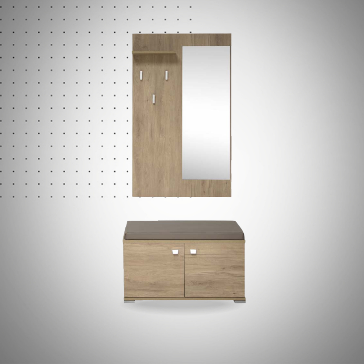 Conçu pour faciliter votre quotidien, le meuble propose un porte-chaussures intégré, une assise capitonnée confortable pour s’asseoir pendant que vous vous chaussez, et un grand miroir vertical pour vérifier votre tenue avant de sortir. C’est un meuble 3-en-1 au design sobre et intelligent, idéal pour ceux qui veulent gagner du temps tout en soignant leur décoration intérieure.