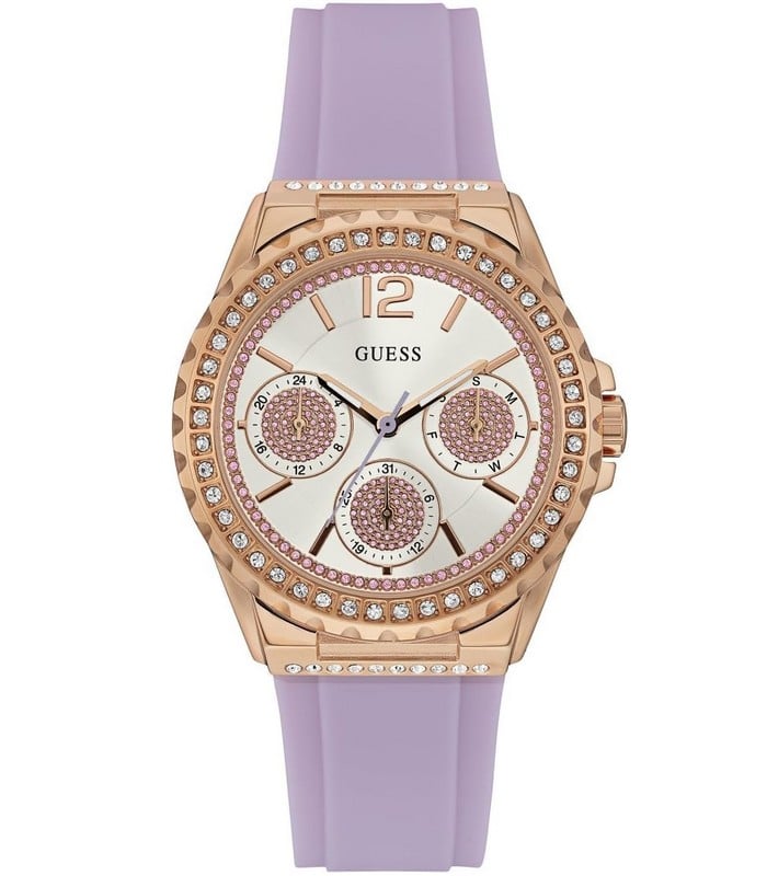 Montre pour Femme de la Marque : Guess – Référence : W0846L6 – Fonctionnalités : Chronographe – Mouvement : Quartz – Matière du boîtier : Acier inoxydable – Diamètre du boîtier : 40 mm – Matière du bracelet : Silicone – Largeur du bracelet : 20 mm – Type de verre : Minéral – Garantie : 2 ans Livré avec son coffret original, sac et certificat d’authenticité.
