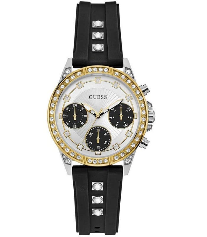 Montre pour Femme de la Marque : Guess – Référence : W1292L1 – Fonctionnalités : Chronographe – Mouvement : Quartz – Matière du boîtier : Acier inoxydable – Diamètre du boîtier : 36 mm – Matière du bracelet : Silicone – Largeur du bracelet : 18 mm – Type de verre : Minéral – Garantie : 2 ans Livré avec son coffret original, sac et certificat d’authenticité.
