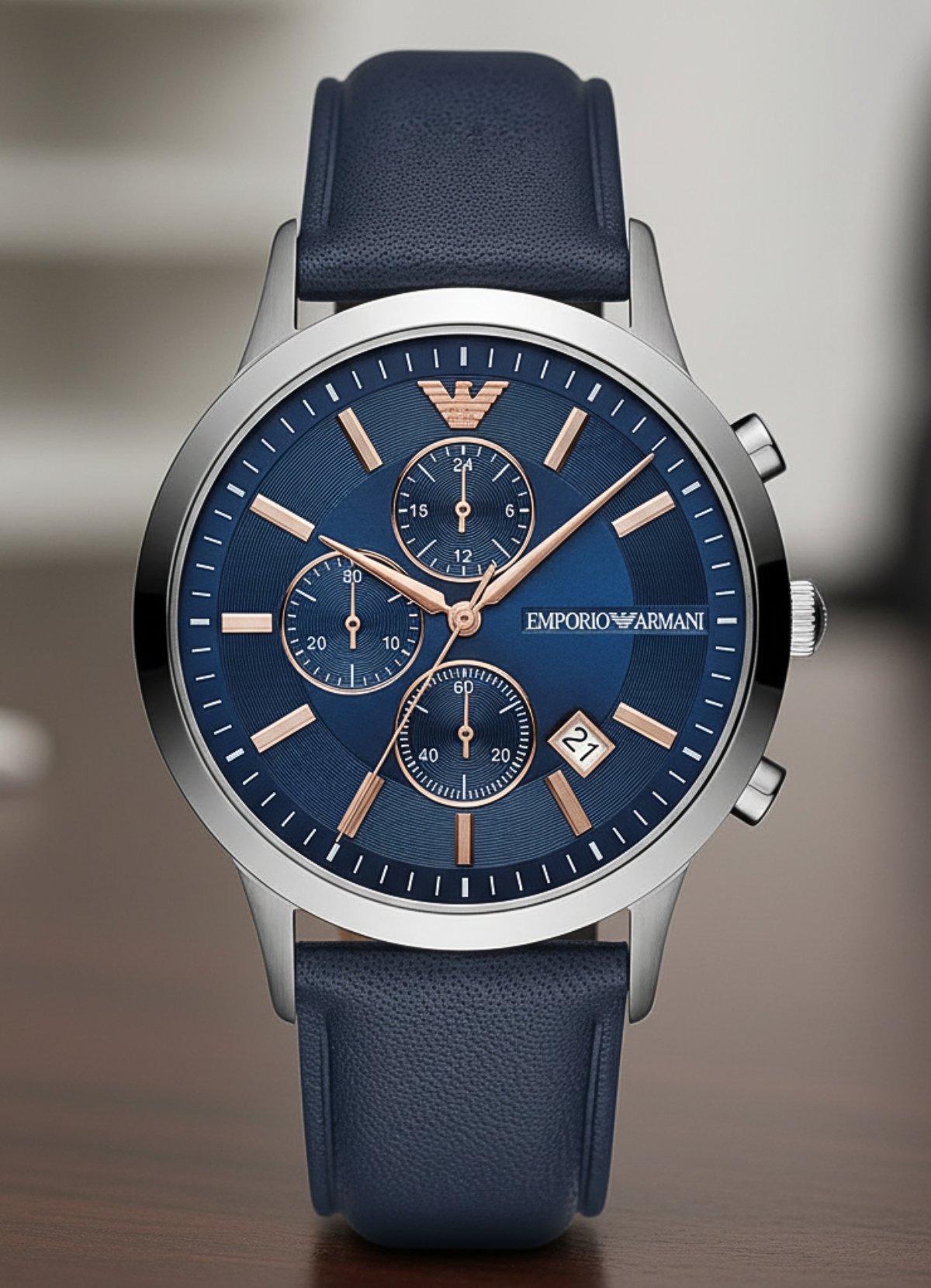Brand Emporio Armani Brand Kind Emporio Armani Renato Gender Men Watch Shape Round Display Type Analog Dial Color Blue Strap Type Leather Strap Color Blue Strap Kind Genuine Leather Band Width 22 mm Diameter 43 mm Thickness 11 mm The Weight ———- Grams Date Monthly Date Water Resistance 50 Meters Design Giorgio Armani Movement Quartz (Battery) Warranty One year against industry defects Special Features Stop watch Product Code AR11216