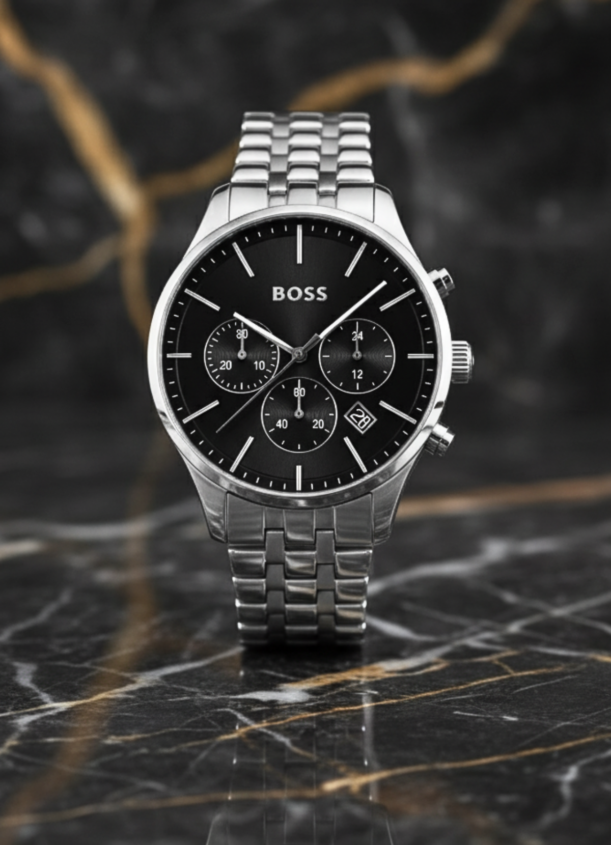 Une montre chronographe BOSS raffinée dotée d’un cadran noir soleillé et de sous-cadrans gravés. Cet accessoire est complété par un bracelet à maillons multiples intégré.