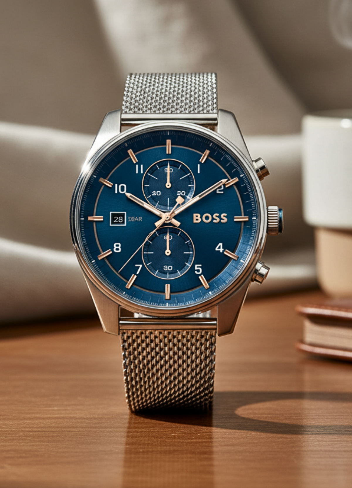 Une montre BOSS moderne style aviateur. Pourvu d’un cadran bleu à deux sous-cadrans et index dorés, cet accessoire s’attache à l’aide d’un bracelet en maille milanaise.