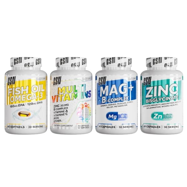 Pack 4×1 Gsn (fish oil omega3+multi vitamines+mag+b-complex+zinc bisglycinate)