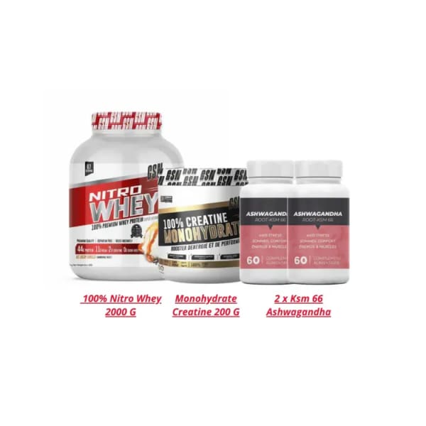 Pack Performance Musculation – GSN Nitro Whey + Créatine 200g + 2 boites Ashwagandha: