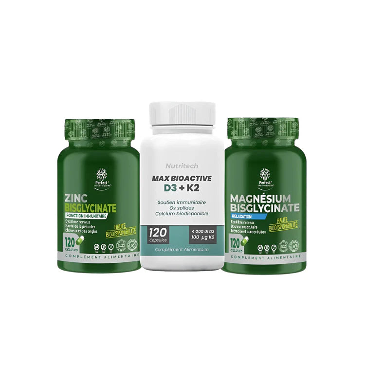 pack trois pièces « nutritech » d3 k2 120capsules +magnésium bisglycinate 120capsules + zinc bisglycinate 120capsules