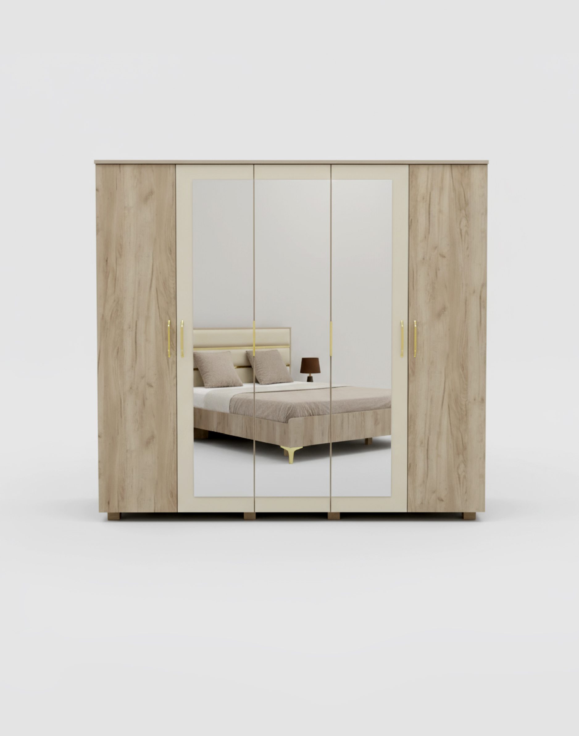 La penderie Havana 5 portes combine design moderne, finition bois clair et détails dorés / Chromés raffinés pour offrir un rangement élégant et fonctionnel. Son style épuré s’intègre parfaitement dans une chambre contemporaine tout en apportant une ambiance chaleureuse et lumineuse.
