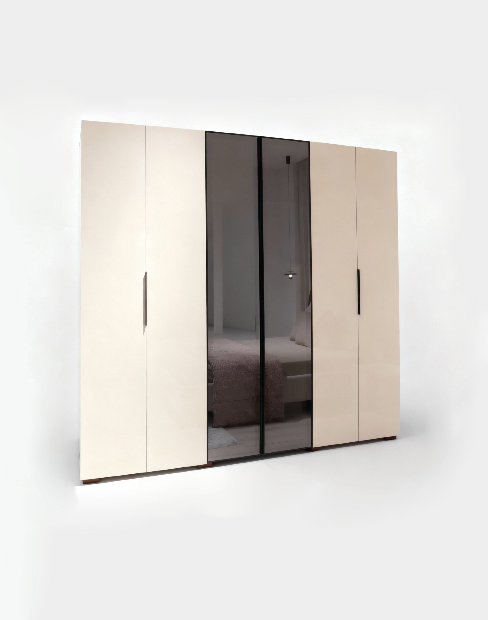 Avec ses 6 portes, ce modèle offre une solution de rangement totale. Derrière ses façades se cache un volume généreux permettant d’organiser penderies, étagères et accessoires sans compromis. Les fines poignées verticales noires assurent une prise en main ergonomique tout en soulignant la hauteur et l’élégance du meuble.