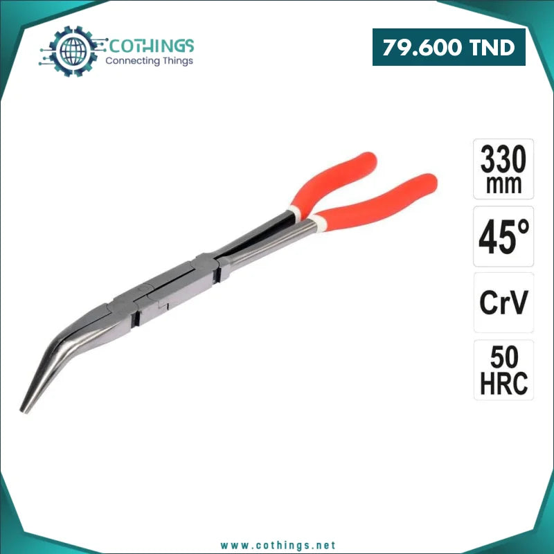 Cette pince à bec courbé de 330 mm est conçue pour offrir puissance, précision et confort d’utilisation. Sa longueur permet d’accéder facilement aux zones étroites et difficiles d’accès, tandis que ses mâchoires dentelées assurent une prise solide et sécurisée sur différents types de pièces.