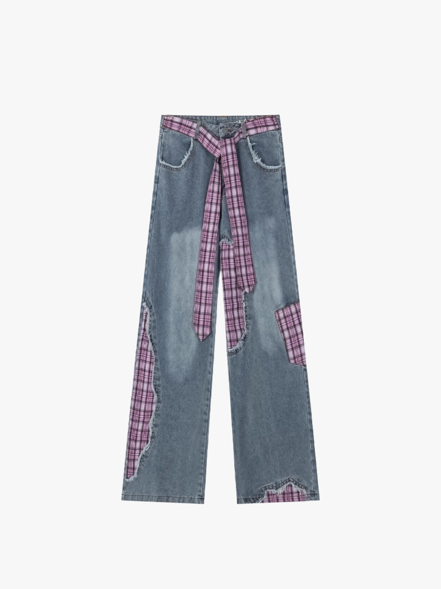 These casual loose jeans feature a unique strappy design with plaid patchwork detailing, blending classic patterns with modern style. Crafted for both men and women, they offer a relaxed fit that ensures comfort without sacrificing fashion. Ideal for everyday wear, these jeans make a distinctive statement while providing ease of movement and versatility in styling.