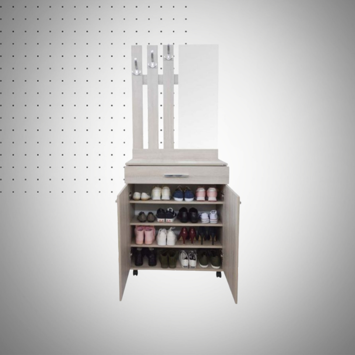 Que vous soyez seul ou en famille, il est facile de se retrouver avec une montagne de chaussures sans savoir où les ranger. Grâce à sa capacité de 16 paires, le meuble Wassim Classique vous évite cet écueil. Son design intérieur astucieux répartit parfaitement l’espace derrière ses deux portes, pour accueillir tous les types de chaussures : baskets, talons, mocassins ou bottines.