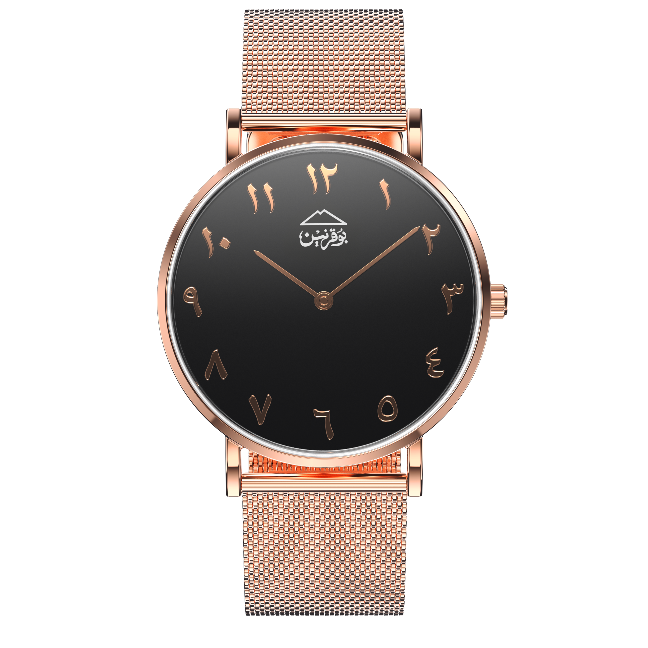 • Cadran avec Calligraphie Arabe : Un cadran noir distinctif orné de chiffres indiens et d’un logo en calligraphie arabe, ajoutant une touche de sophistication et de style unique, symbolisant la fusion culturelle et l’héritage artisanal.