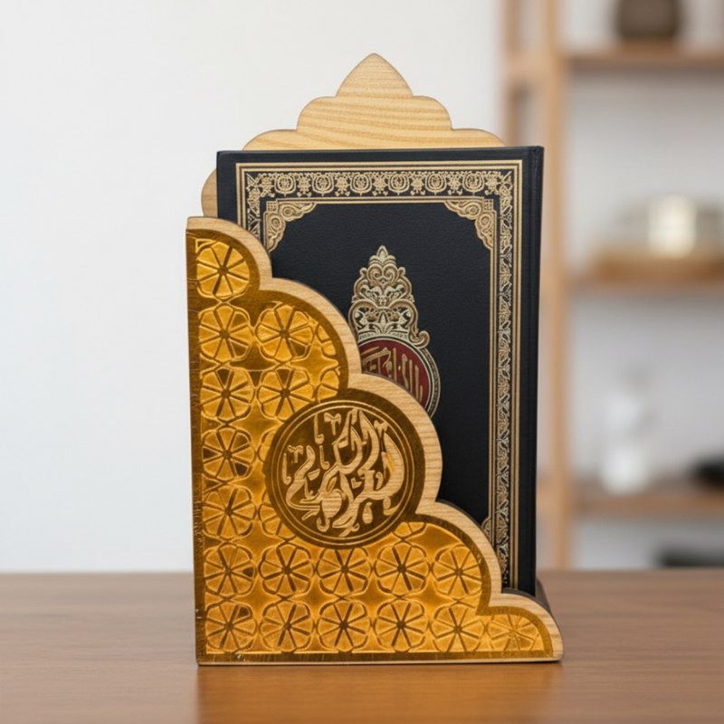 Fabriqué en bois robuste avec une façade dorée ornée de motifs géométriques islamiques, ce support maintient parfaitement le Moshaf en position verticale tout en le protégeant de la poussière et des manipulations fréquentes. Son design travaillé avec calligraphie centrale apporte une présence spirituelle et chaleureuse à votre intérieur.