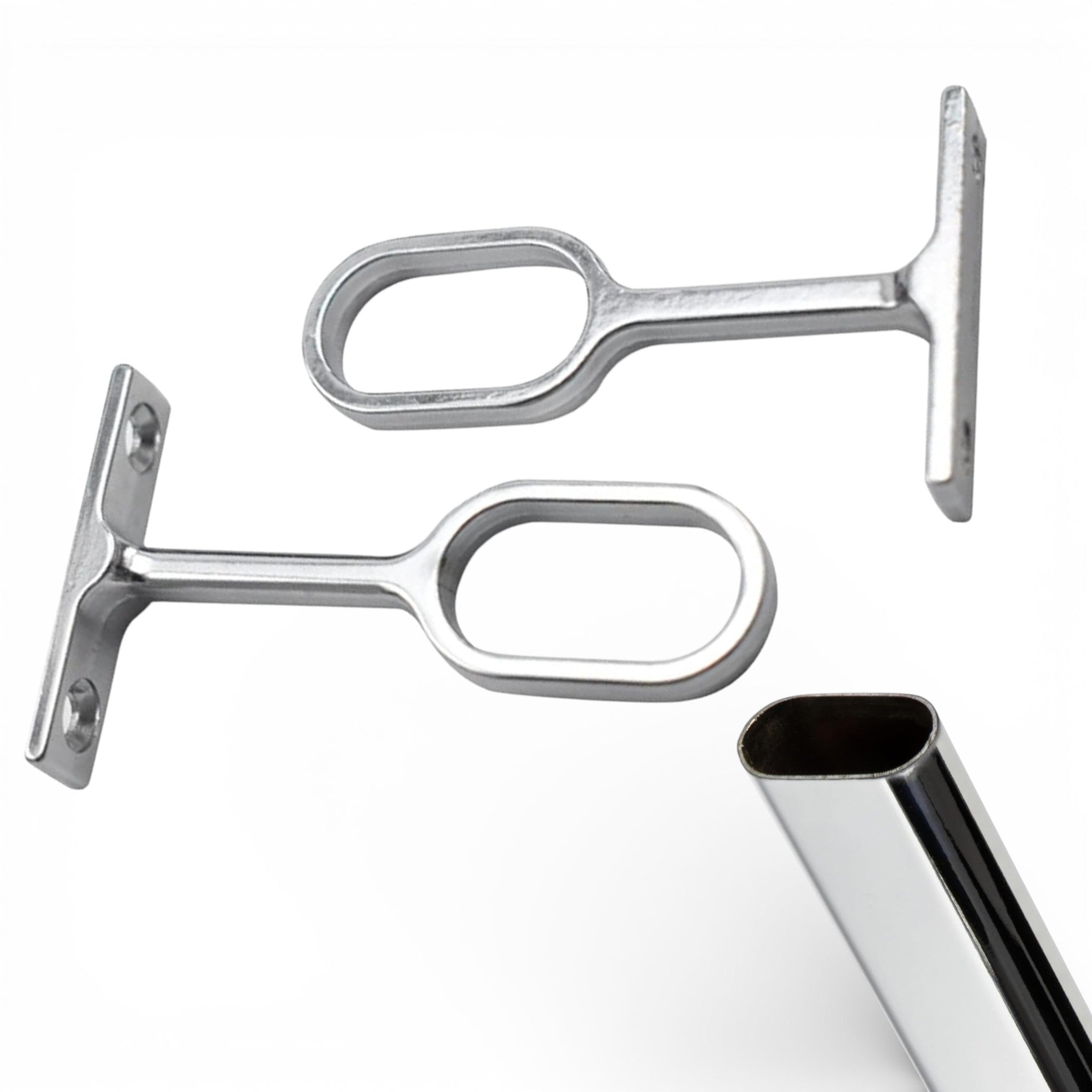 Utilisations : Support pour tringles à rideaux ovales, fixation de tubes pour cintres dans armoires et dressings, barres de penderie ovales.