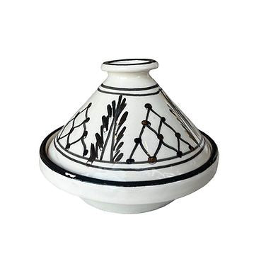 tajine petit modéle est une petite merveille de l’artisanat marocain. Entièrement fait main en céramique blanche, il se distingue par ses motifs graphiques peints en noir et marron.