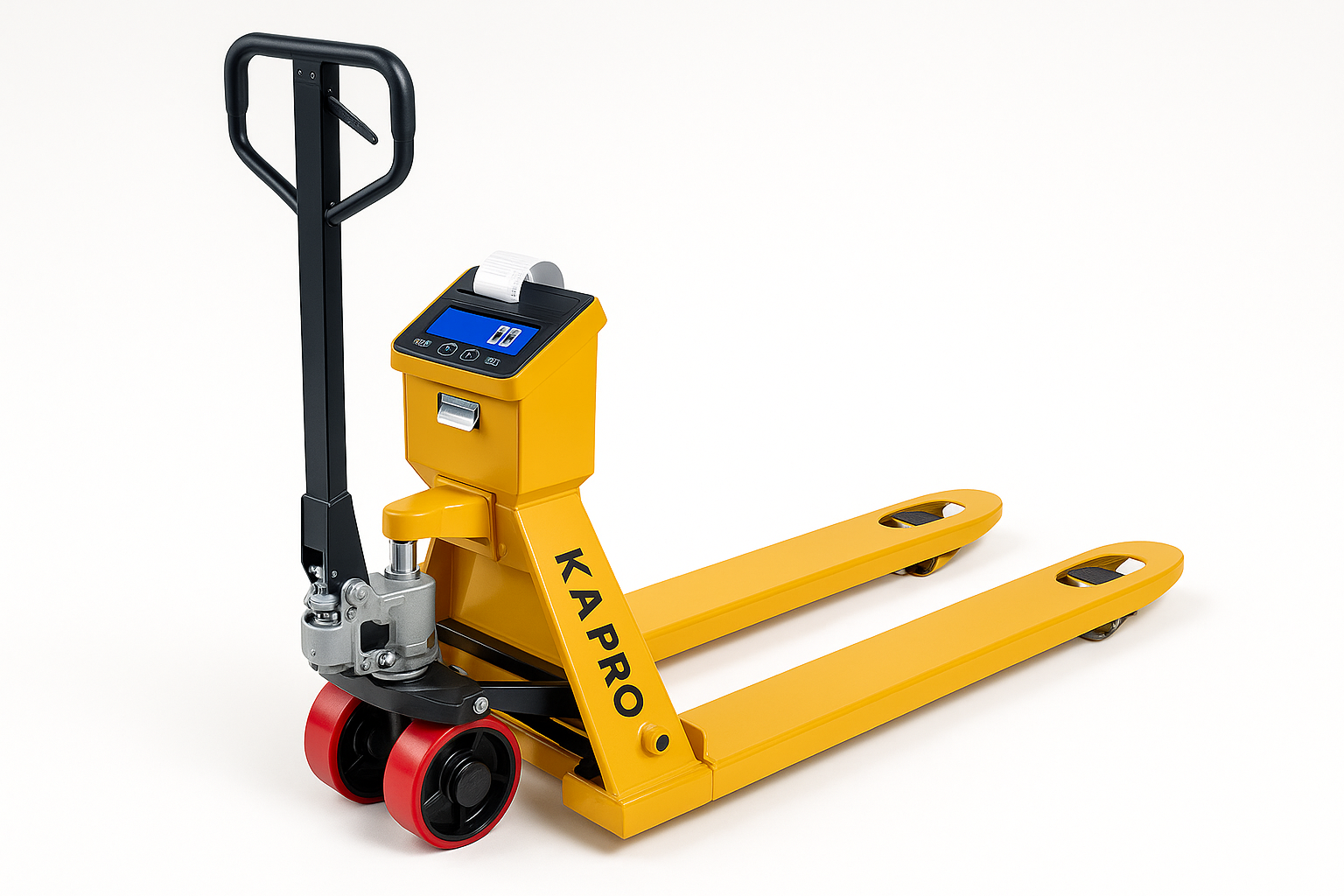 Transpalette peseuse professionnelle 2.5 tonnes avec système de pesage intégré et imprimante pour tickets. Solution complète pour la manutention et le contrôle de poids simultanés. Disponible chez quincaillerie l’espoir SQES.